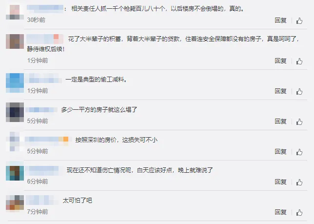 據(jù)悉,倒塌的是一棟6層的待拆遷樓房,事發(fā)前有居民居住,但是樓房出現(xiàn)異響后已經(jīng)提前撤離。目前,應(yīng)急管理部門,包括消防部門已經(jīng)攜帶有毒氣體探測(cè)儀、生命探測(cè)儀等救援設(shè)施趕到現(xiàn)場(chǎng),正在對(duì)樓體的結(jié)構(gòu)安全進(jìn)行評(píng)估,制定后續(xù)的處置措施。 深圳消防表示,消防接報(bào)后迅速出動(dòng)處置,目前事故仍在處置中。 部分網(wǎng)友評(píng)論: